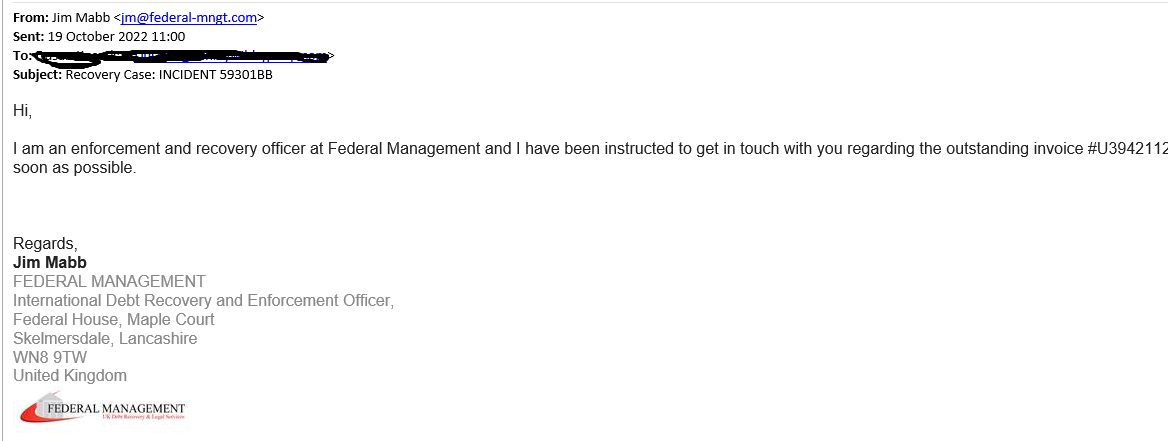 We have also received reports that criminals calling themselves Jim Mabb, Enforcement Officer are sending emails from email address: jm@federal-mngt.com
